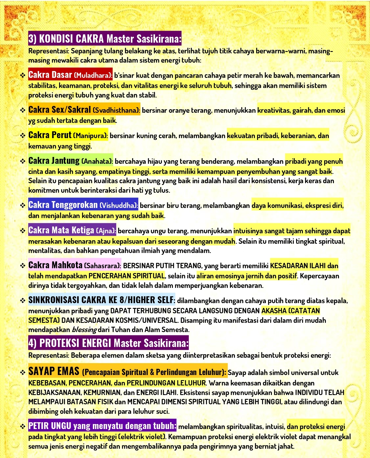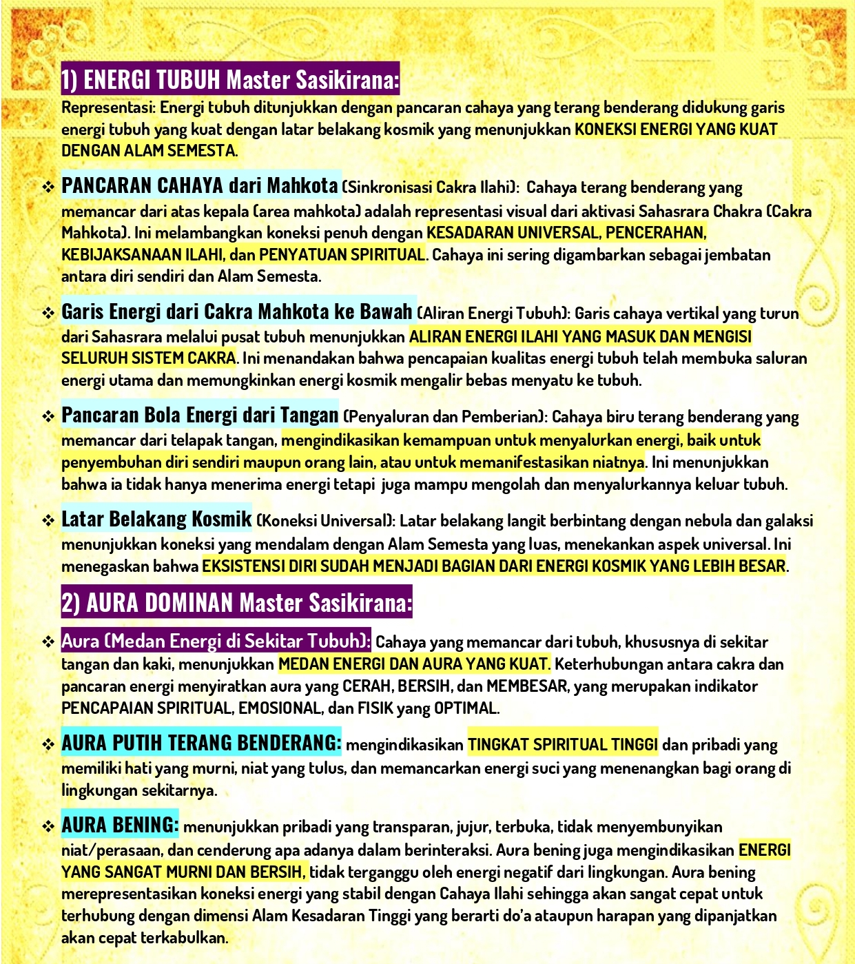 Aura dan energi Master Sasikirana bukan hanya sekadar pancaran energi, tetapi merupakan refleksi dari pencapaian spiritual yang telah ia lewati. Cahaya aura bening melambangkan kekuatan spiritual yang sangat tinggi, kejernihan pikiran dan kesucian hati. Cahaya emas mencerminkan kebijaksanaan universal dan keagungan spiritual. Cahaya perak menandakan kualitas kecerdasan serta ide-ide kreatif inovatif dan cahaya perak ini juga menandakan sebuah kualitas kecepatan dalam terkabulnya doa atau Blessing energy. Cahaya aura putih menandakan kesucian bathin dan pikiran serta kesempurnaan energi dan juga koneksi yang intens dengan dimensi Ilahi dan kualitas lainnya.